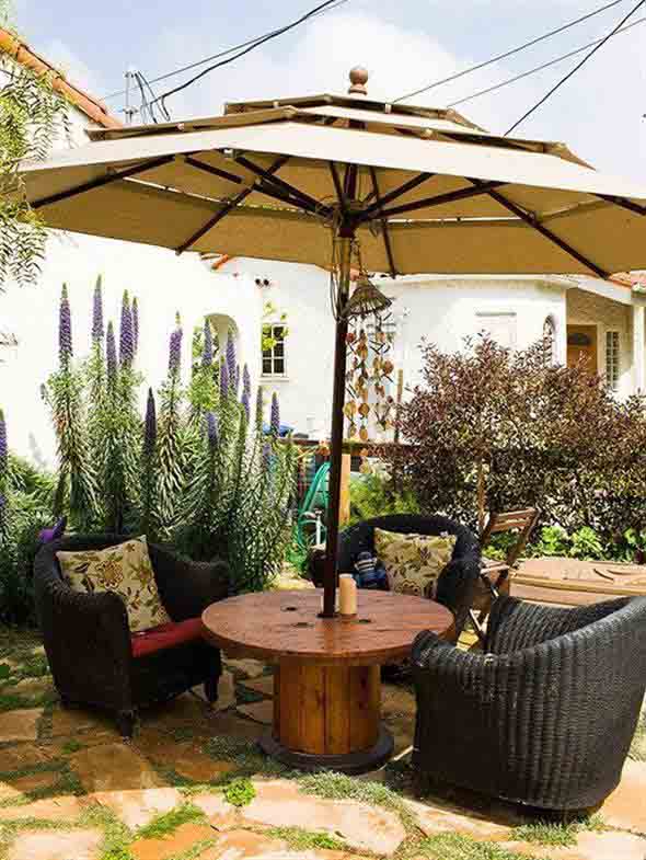 E na sua casa você pode encontrar um local ideal para uso de mesas e bancos feitos com carretel de madeira.