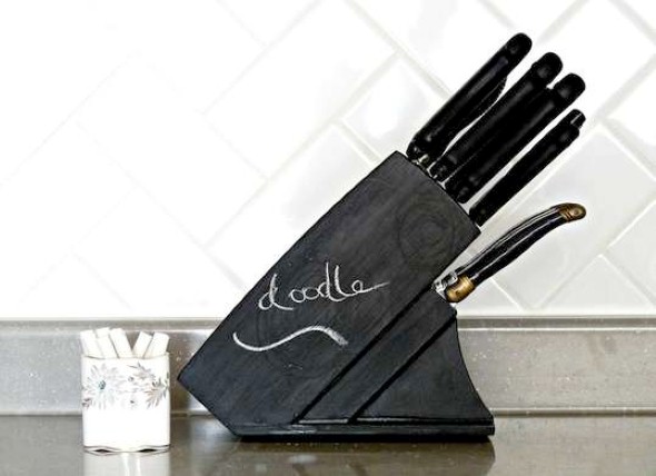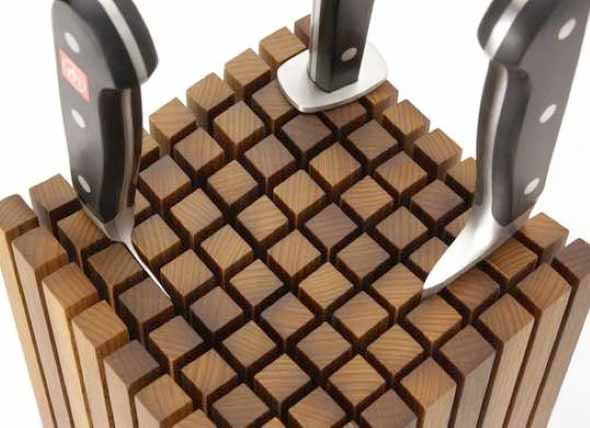 Em cozinhas com balcão de madeira ao lado da pia, ou mesmo aquela mesa integrada com a bancada, uma abertura pode ser feita por um marceneiro para colocação das facas mais usadas na cozinha.