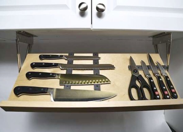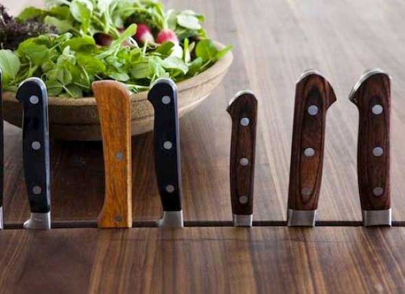 Deste modo elas ficarão muito mais acessíveis, e bem práticas para uso diário. Mas é importante que a fenda seja bem pequena, para que as facas não caiam do balcão.