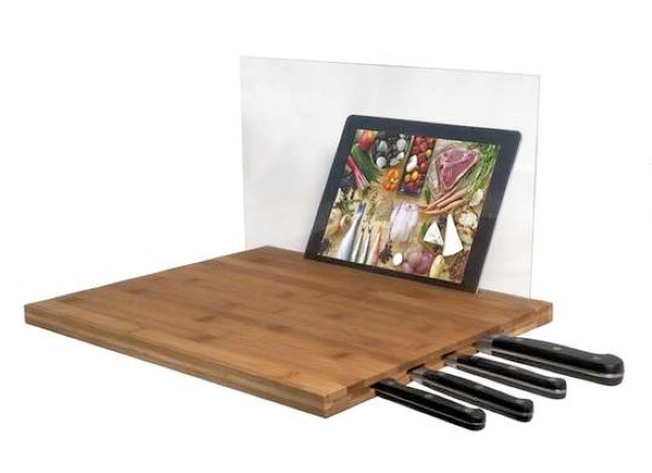 Este é um modelo personalizado de tábua de corte, que pode ser feita por um marceneiro ou artesão aí na sua cidade, e vai permitir que você prepare diversos alimentos enquanto confere as receitas na internet.