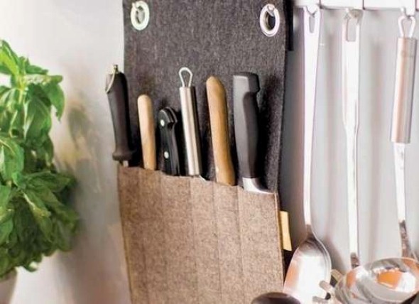 Há também os modelos de suporte para facas feito em tecido, que podem ser pendurados na cozinha, em uma altura prática para uso.
