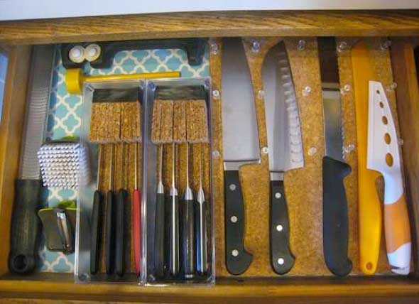 Basta colocar uma folha de cortiça nas gavetas, e depois fixar taxinhas de escritório para manter todas as facas em seu lugar, facilitando desta forma a organização.