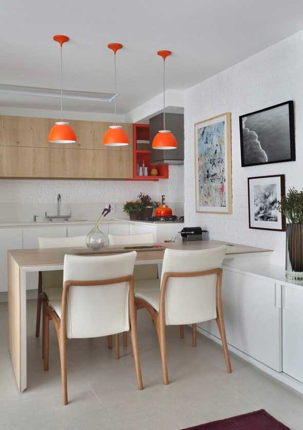 Em cozinhas com visual mais clean, a dica é usar quadros coloridos, que criam um contraste bem interessante, e ainda valorizam alguns detalhes da decoração.
