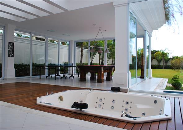 Os decks de madeira também são muito utilizados ao redor da piscina, e garantem um local arejado e charmoso para apreciar o sol com toda família.