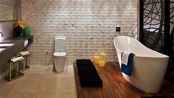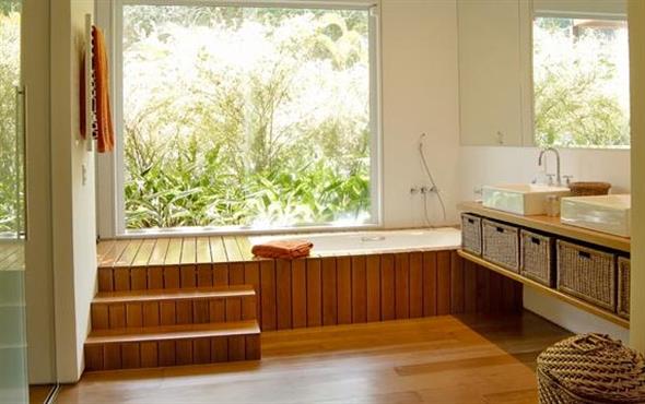 E seu uso pode se estender aos vários cômodos da casa, como o banheiro, que vai se tornar um lugar muito mais elegante com o uso de decks, que podem ser combinados com painéis e bancadas de madeira.
