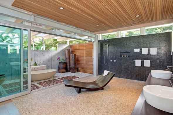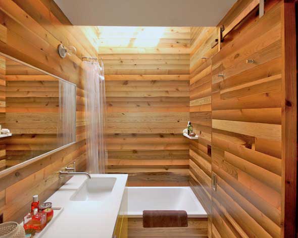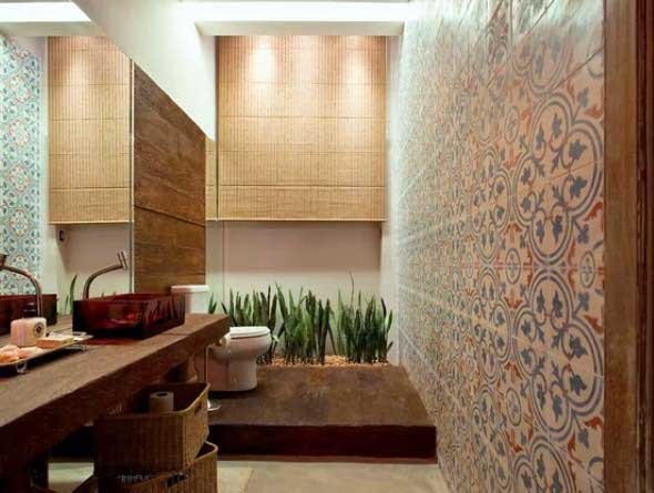 Na decoração do banheiro o bambu é muito bem vindo, pois é um material de fácil manejo, que possui boa durabilidade em contato com umidade, além de ser um recurso amplamente renovável, e com isso garante maior preservação da natureza. Da mesma forma os revestimentos em madeira são uma opção elegante e charmosa de decoração do banheiro