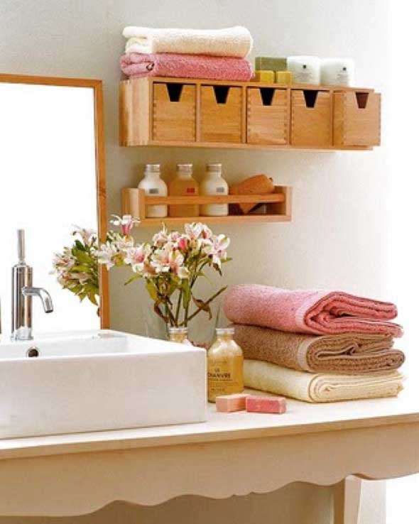 Usar bandejas de madeira no banheiro para organizar toalhas e escovas de dente estão em alta.