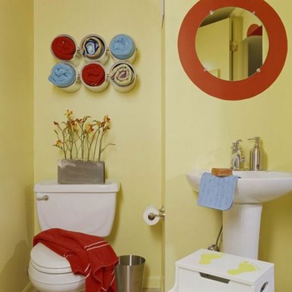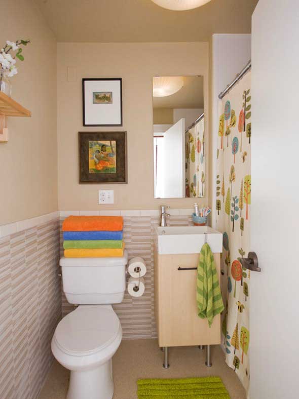 Para dar um toque de cor adicional ao banheiro invista em toalhas, cortinas, tapetes, bordados, ou mesmo pequenos objetos decorativos em cores vibrantes para usar no banheiro.