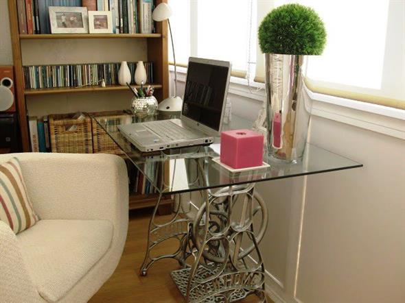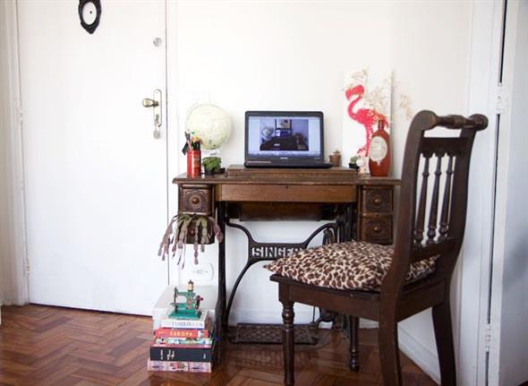 Até a montagem de um home Office fica mais charmosa com a utilização de uma mesinha feita com sua máquina de costura antiga.