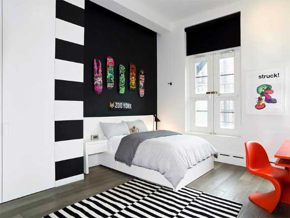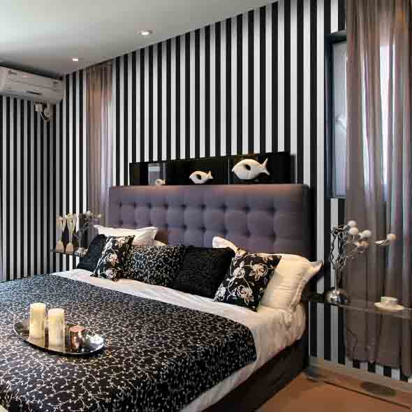 A pintura listrada é outra forma de deixar a combinação preto e branco mudar o estilo do quarto, e pode ser feita por cima de outras pinturas, desde que elas não sejam tão antigas.