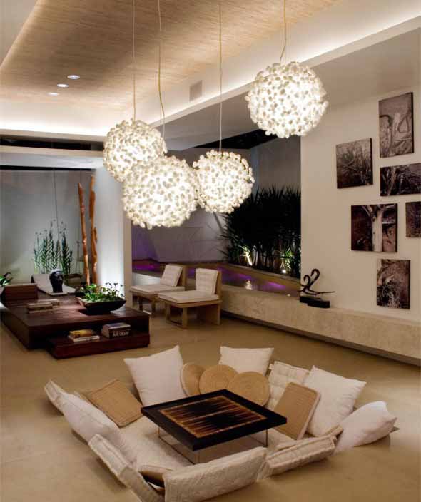 Em relação a iluminação, ela pode ser centralizada, com o uso de um lustre ou luminária pendente, ou feita com spots de luz acomodados em um forro de gesso ornamentado.