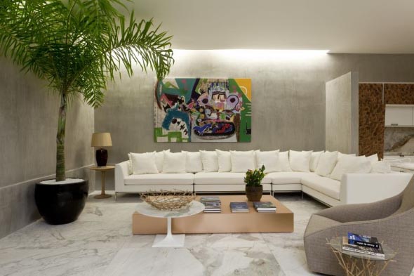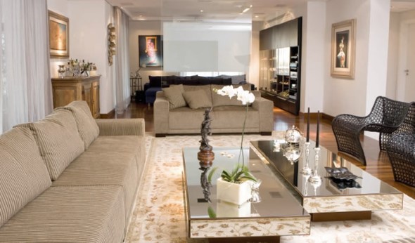 Para finalizar o visual da sala, opte pelo uso de peças de arte, como quadros, estátuas, amplos tapetes e vasos, que complementam este estilo moderno e bem atual na decoração.