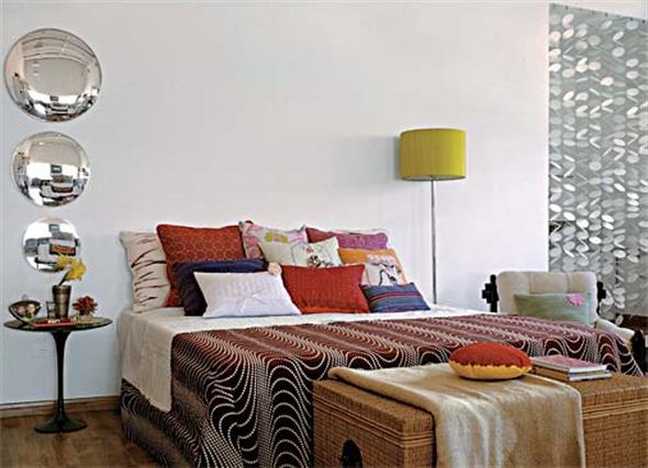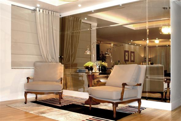 Outra dica bem bacana é o uso dos painéis de espelhos para parede, que podem ser projetados e montados por uma vidraçaria especializada aí da sua cidade, e instalados na sala de estar, na cozinha ou no quarto do casal.