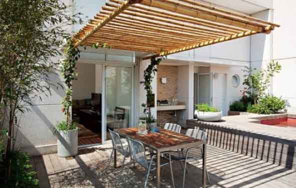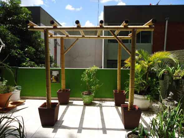 Até nas áreas externas da casa o bambu vai gerar um belo destaque visual, pois pode ser usado para montagem de pergolados, cercas de plantas, cadeiras de jardim, e muito mais.