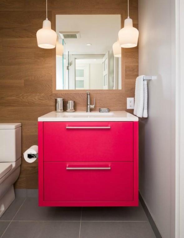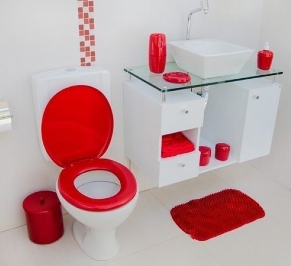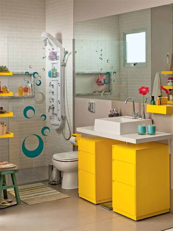Até mesmo os pequenos detalhes, como a tampa do vaso sanitário, a moldura do espelho, os acessórios para guardar itens, dentre outros, ajudam a descarar um belo visual colorido na decoração deste cômodo.