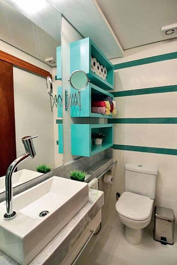 Em seguida podem ser usados armários ou nichos no banheiro, ou até mesmo no lavabo da casa, em cores variadas e que se destaquem na decoração.