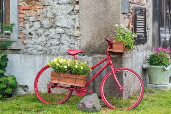 Também é possível transformar as bicicletas em peças artísticas, como uma jardineira ou uma pia de banheiro, que vão ficar muito charmosas e bem convidativas.