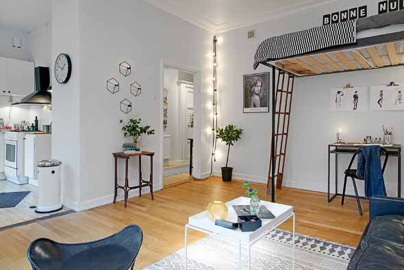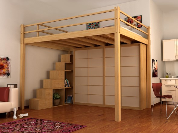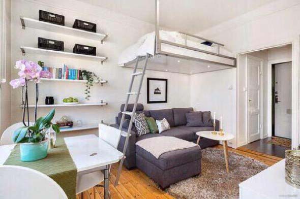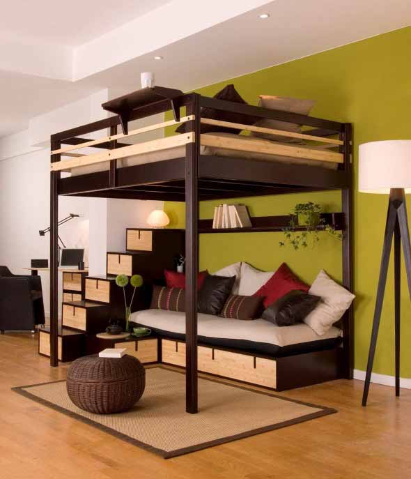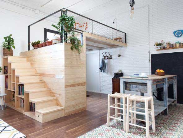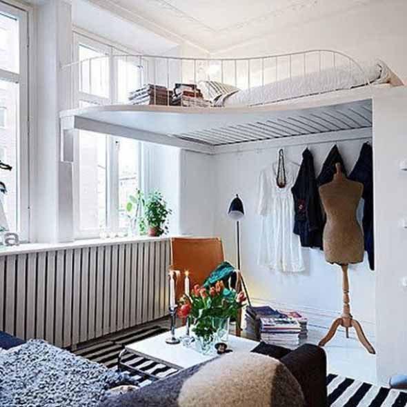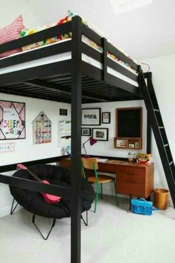 Mas a cama elevada também pode ser montada em outros cômodos da casa, como a cozinha ou a sala de estar, principalmente quando a casa tem o pé direito bem elevado.