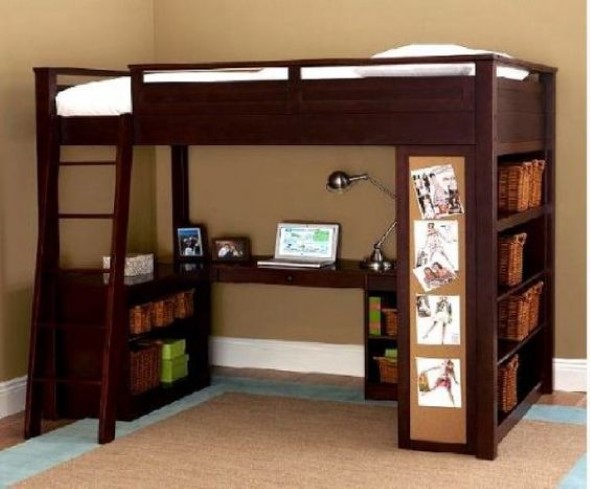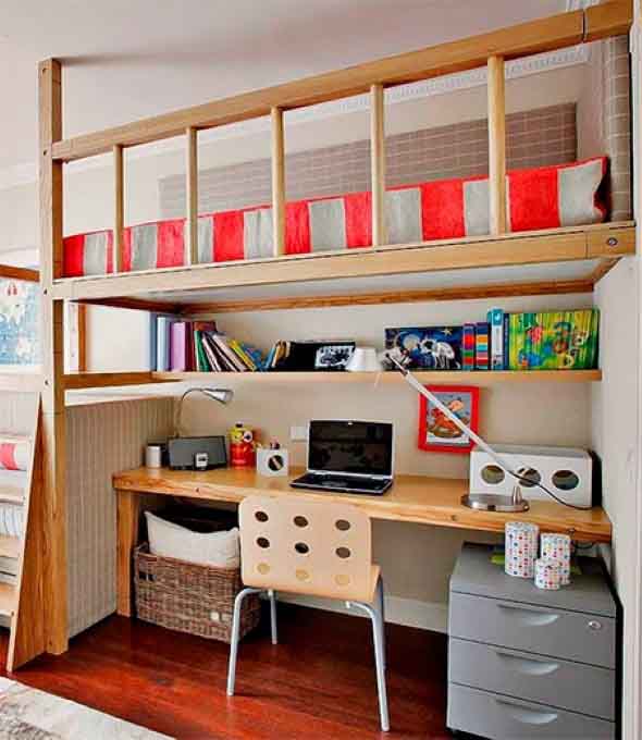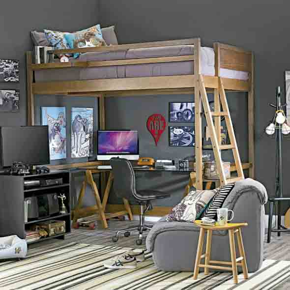 Para ter uma cama elevada em casa, uma das primeiras opções é a compra de camas em estilo beliche, mas que possuem na parte de baixo um espaço projetado para outras finalidades, como um escritório pessoal ou um armário embutido.