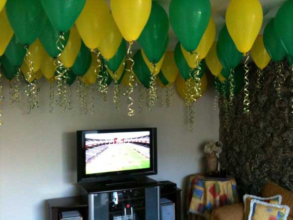 Esta decoração pode ser um pouco mais ousada, e incluir objetos e itens de decoração variados, como almofadas, canecas, puffs, faixas, pelúcias, e muito mais, que podem ser usados na sala, na varanda ou em outros ambientes escolhidos para assistir cada partida.