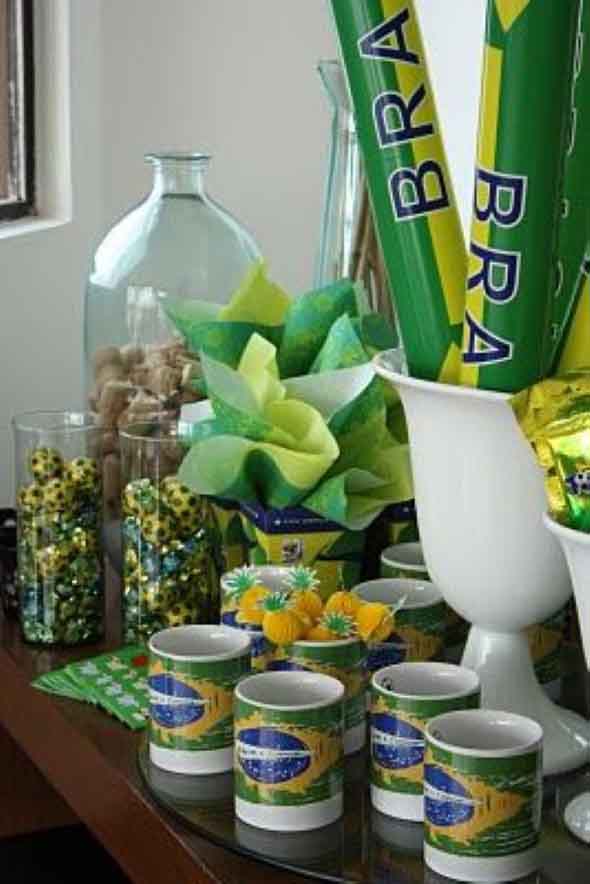 Tem também aquela mesa preparada com comes e bebes para celebração da Copa do Mundo, que pode ser enfeitada nas cores brasileiras, e recheada de coisas apetitosas, ou um belo churrasco de comemoração.