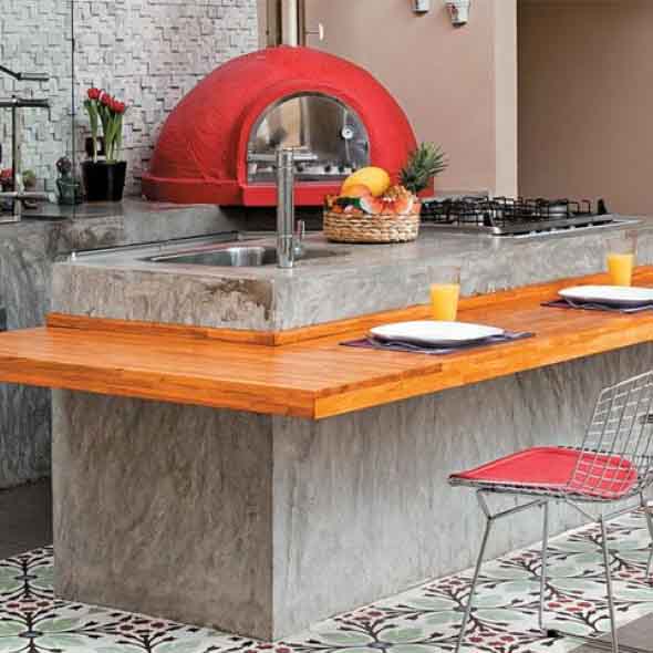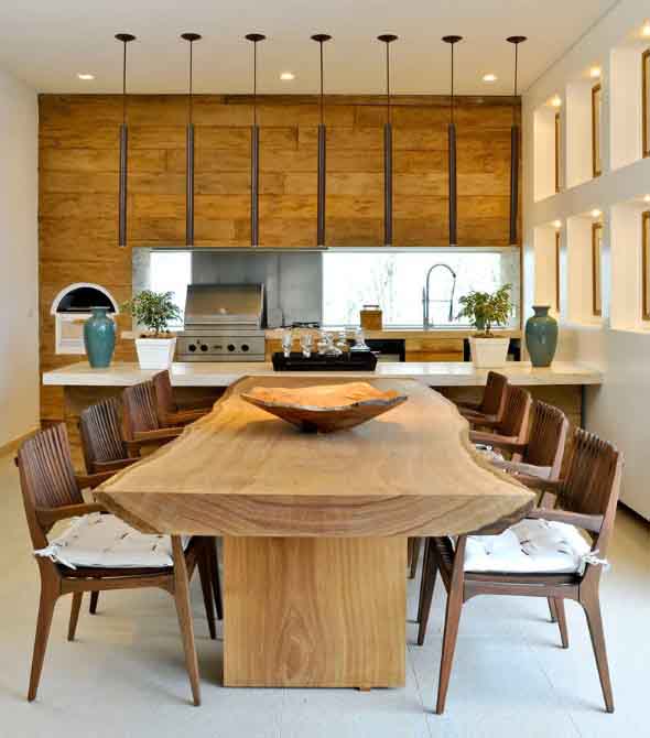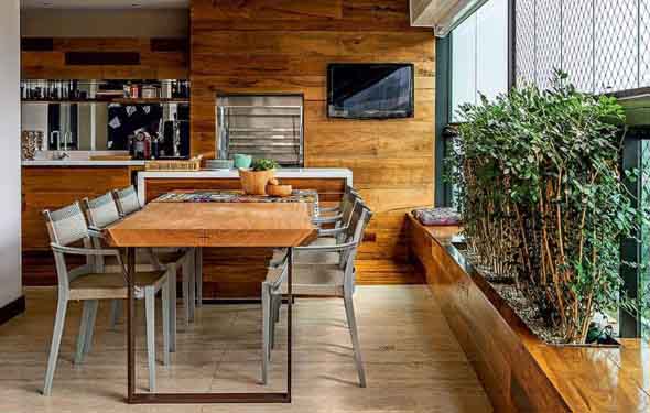 O balcão de madeira integrado é outra opção que vem sendo incorporada nas cozinhas mais atuais, e que pode garantir um visual mais rústico ao local.