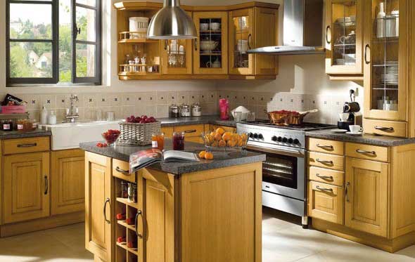 Uma das maneiras para ter uma decoração rústica na cozinha de sua casa é investir em móveis de madeira com aquele visual envernizado, e que deixa os veios da madeira mais a mostra.