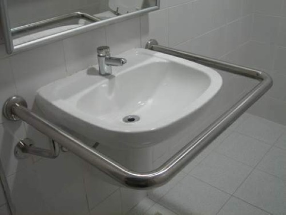 3. Ao lado do lavatório a barra pode ser do tipo U, que circula a pia, ou em formato L, caso a pia seja muito próxima da parede. A distância mínima entre o suporte de apoio e a pia é de 4 cm;