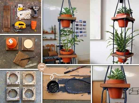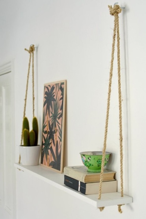 As prateleiras suspensas são muito indicadas para economizar espaço dentro de casa, e podem ser montadas com o uso de cordas e madeira de demolição.