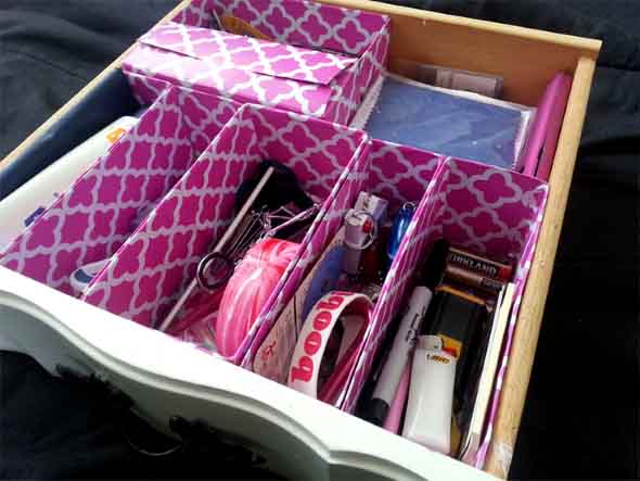Até nas gavetas vocês podem colocar caixas organizadoras, que podem ser feitas com o uso de caixas de leite e embalagens de papelão, e vão deixar suas gavetas mais organizadas.