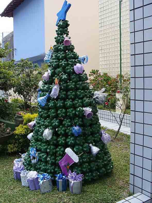 Uma das ideias para usar a reciclagem na decoração natalina é a montagem das árvores de natal, que pode ser fabricada com caixas de papelão, latinhas, garrafas pet, pedaços de madeira e muitos outros materiais.