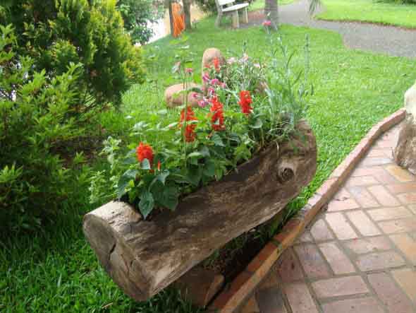 Troncos de árvores podem ser usados como jardineiras, que vão deixar as plantinhas florescerem com muito mais charme e simpatia.