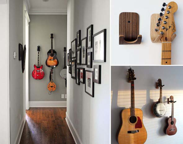 E uma das dicas para incorporar instrumentos musicais na decoração é pendurá-los nas paredes, com o uso de apoios apropriados, que vão deixar cada instrumento musical bem aparente no visual do cômodo escolhido.