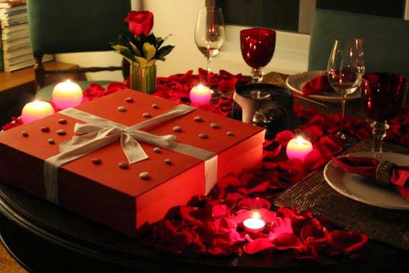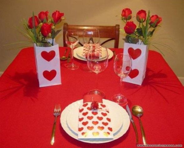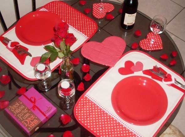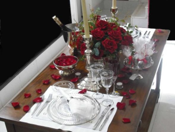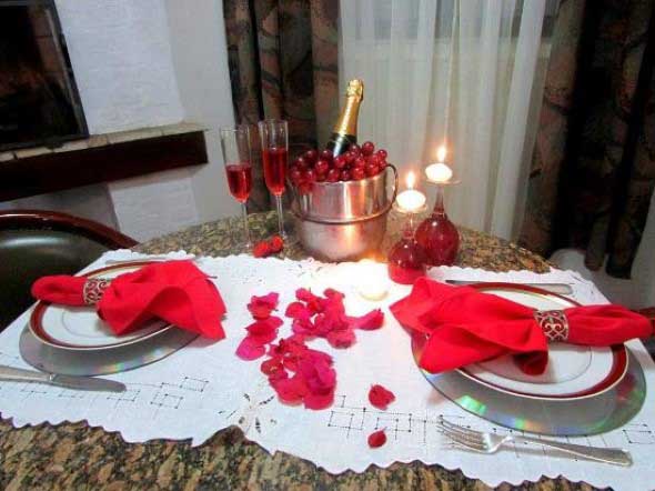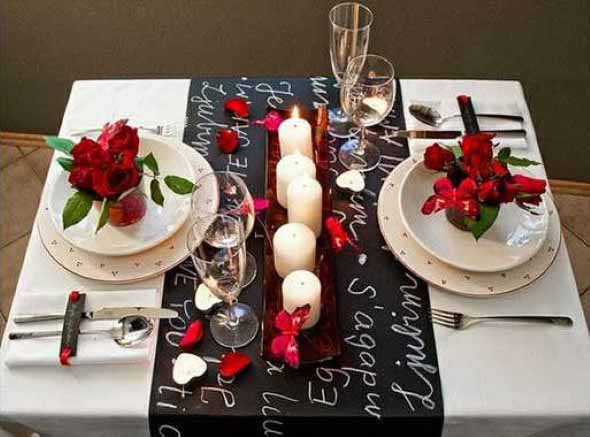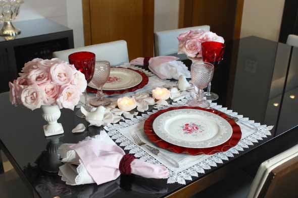 Na mesa podem ser colocadas rosas para realçar o clima amoroso, em vasos simples ou apenas deixadas na mesa, sem sobrecarregar o visual.