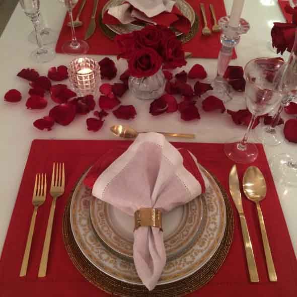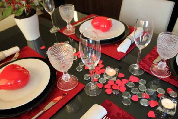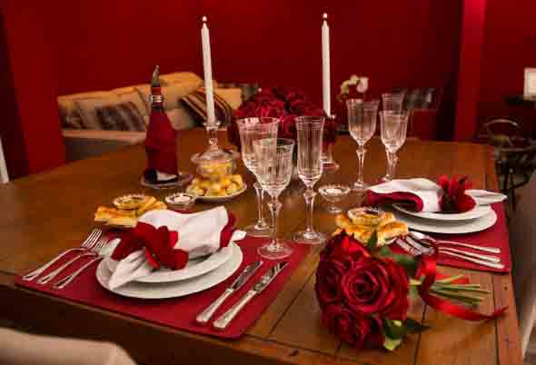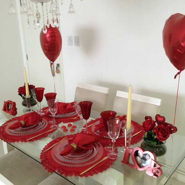 A mesa de jantar do dia dos namorados deve ter um visual bem romântico, que fica bem marcante com o uso de tons de vermelho na decoração, presentes em guardanapos, taças, enfeites, e muito mais.
