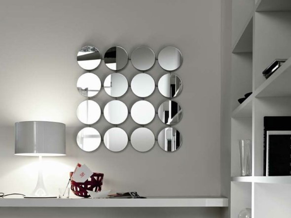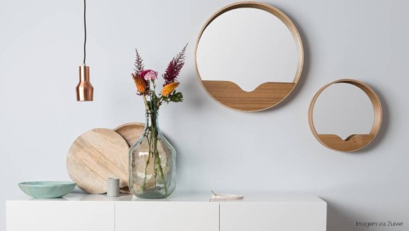 Espelhos redondos múltiplos também podem ser usados na decoração, e vão garantir uma boa composição com outros elementos decorativos, sem sobrecarregar o ambiente.