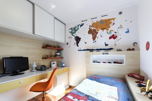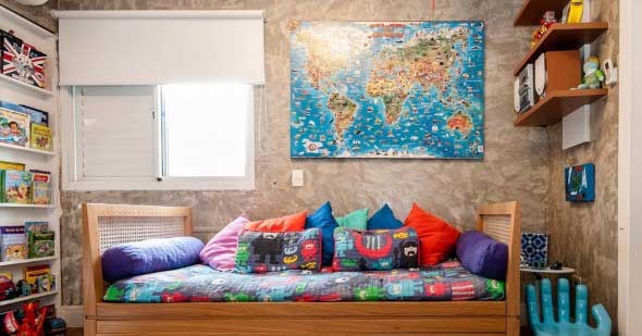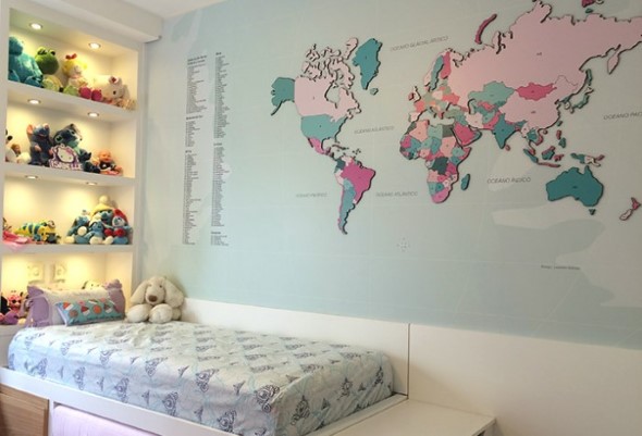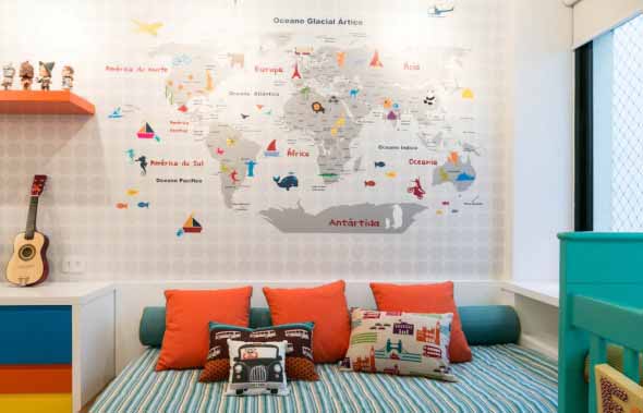 Já no quarto das crianças pode ser usado um mapa mundi mais descontraído, que vai ajudá-las a aprender mais sobre diversos continentes pelo mundo afora, de uma maneira bem criativa.