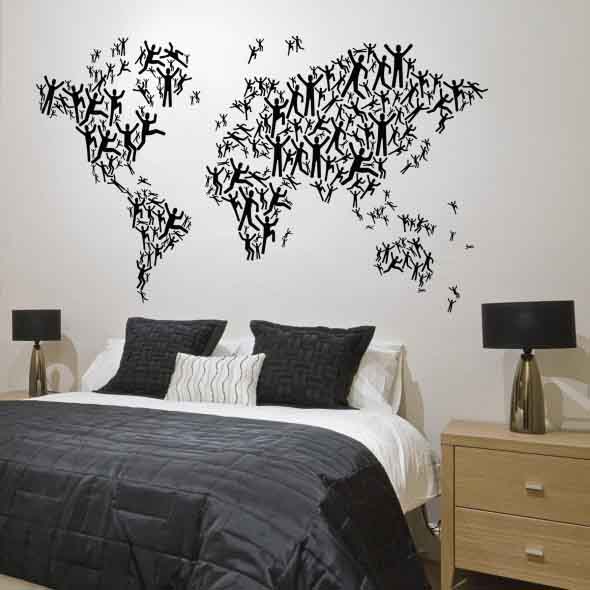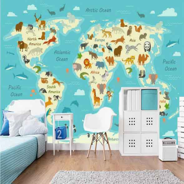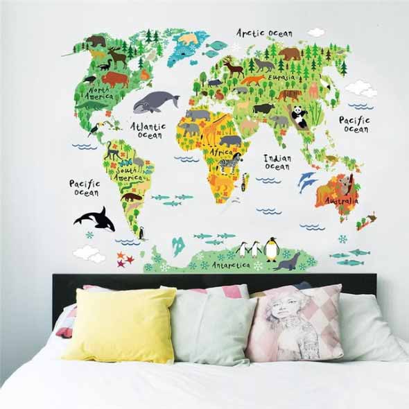 Uma das primeiras opções para decorar o quarto com mapa mundi é o uso de painéis vinílicos, que são estampados em gráficas especializadas, em tamanhos que se adaptam perfeitamente nas dimensões de algum quarto da casa.