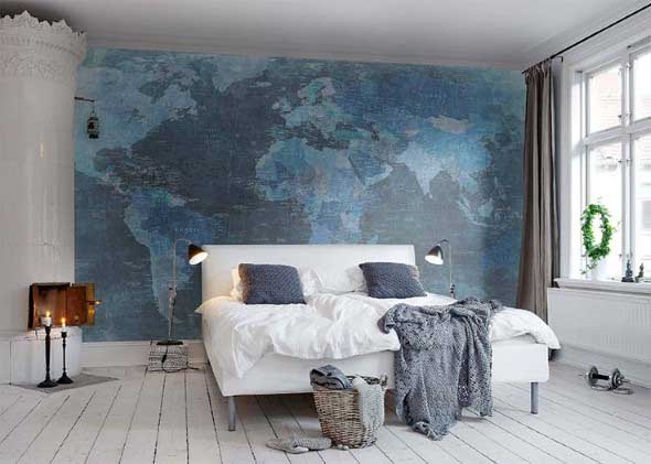 E um dos cômodos da casa que tem muito a ganhar com este estilo de decoração é o quarto, que vai se tornar um ambiente mais convidativo com o uso do mapa mundi na decoração.