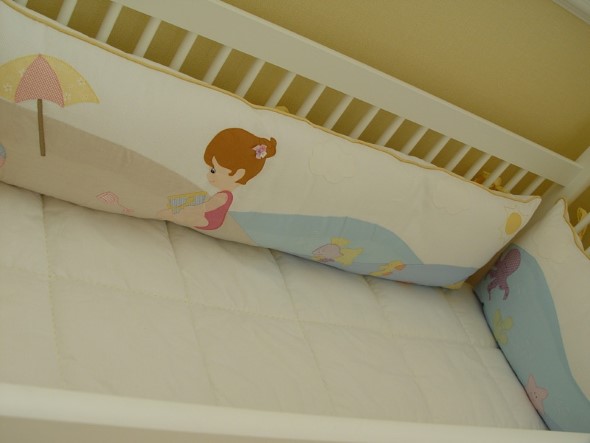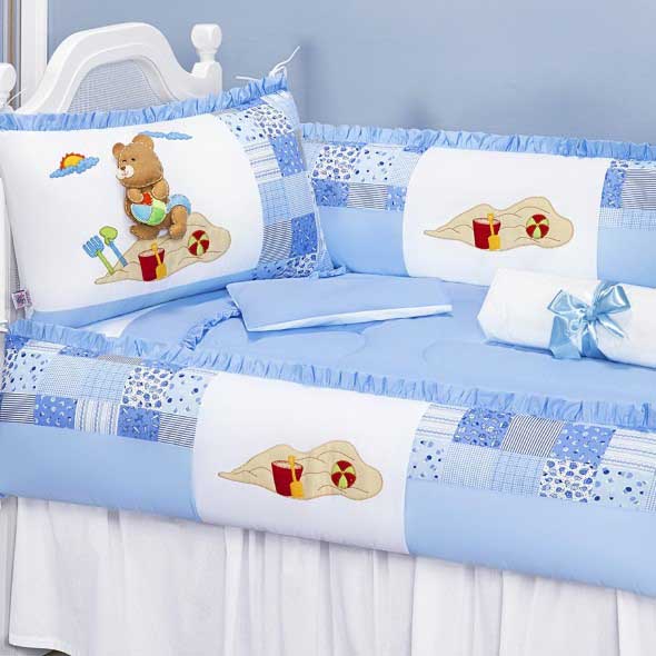 Tem também os kits de berço, que podem ser encomendados com o tema praia, em modelos com fronhas, mantas, saia para berço, e outros acessórios encantadores.