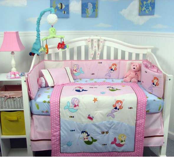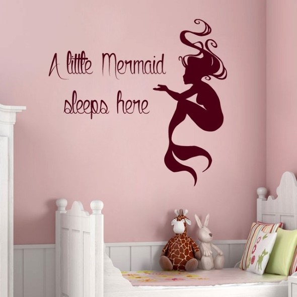 Na parede pode ser colocado um papel de parede com desejos de animais marinhos, ou uma bela pintura artesanal de sereias, peixinhos ou o fundo do mar.