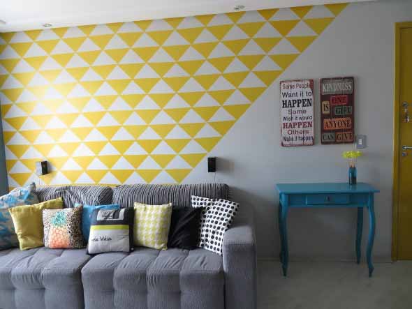 Outra dica que vai lhes ajudar a renovar o visual deste ambiente é criar uma pintura geométrica nas paredes, que pode ser feita com o uso de fitas adesivas ou moldes e tinta spray (ou outra tinta), e aplicada por cima de uma pintura já existente (desde que as paredes não estejam rachadas).