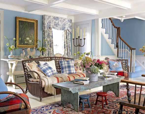 Na sala de estar os baús com visual antigo são uma boa opção decorativa, bem como o uso de tecidos de renda ou xadrez, em almofadas e mantas nos sofás e poltronas.