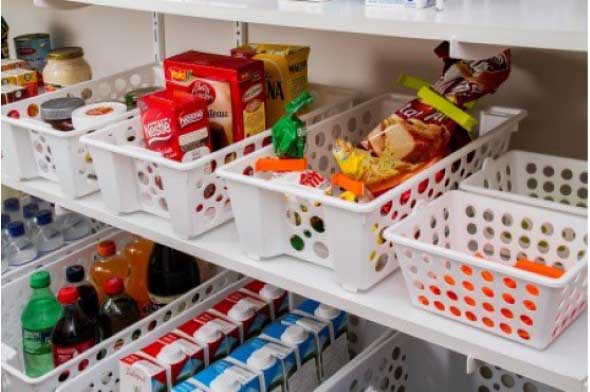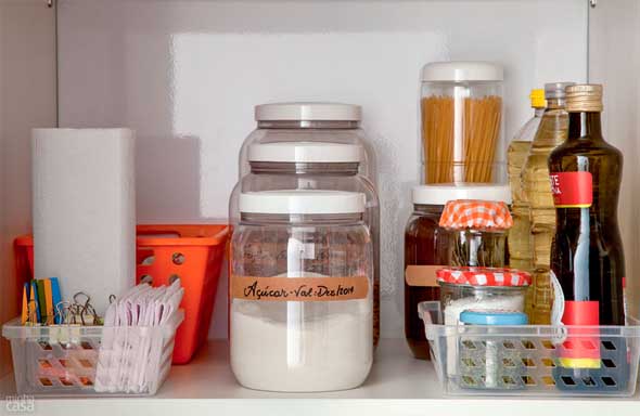 Nestas horas você pode usar cestos e potes para organização, que são ideais para separar cada item. Aqui a dica é usar potes de vidro para armazenar grãos, como arroz e feijão, biscoitos e bolachas, farinha, dentre outros itens, que depois de abertos devem ser consumidos mais rapidamente.