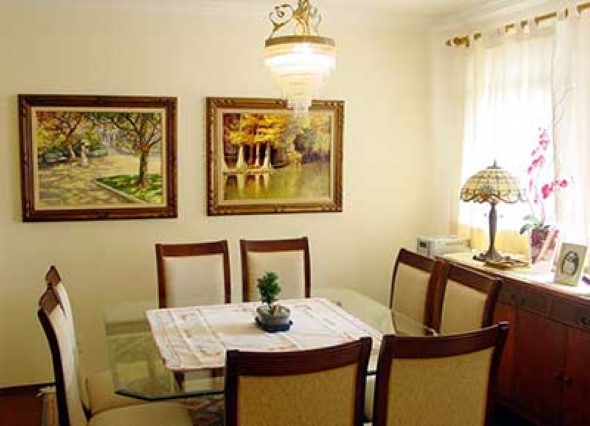 Em volta da mesa podem ser colocados quadros, com pinturas, paisagens ou retratos de família, que são fáceis de incorporar na decoração de cada cantinho da casa.