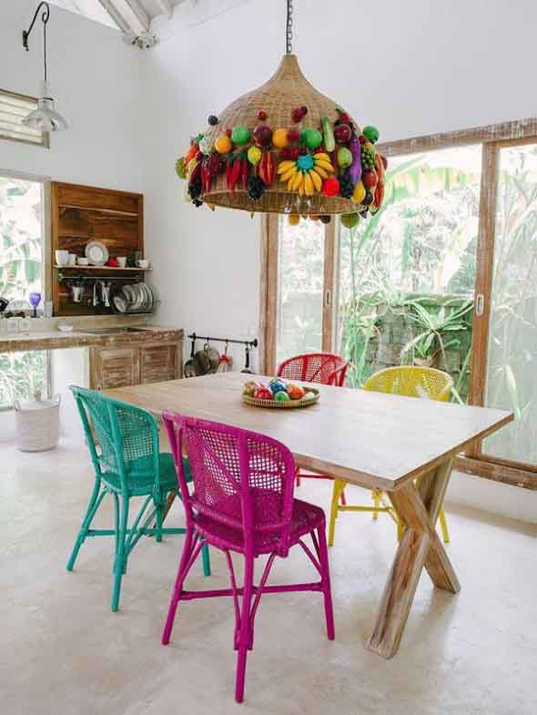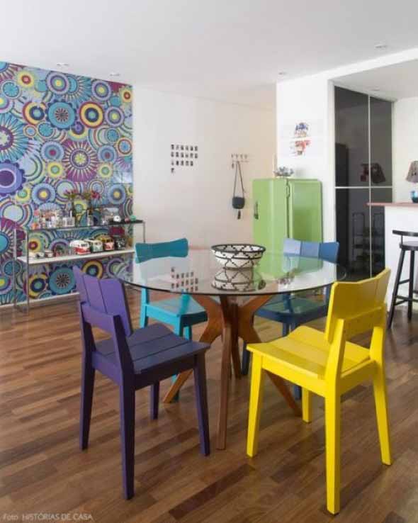 Na sala de jantar o móvel principal é a mesa, que pode ser redonda ou quadrada, aliada a um conjunto de cadeiras, em cores singelas, ou em um colorido bem diferenciado na decoração.