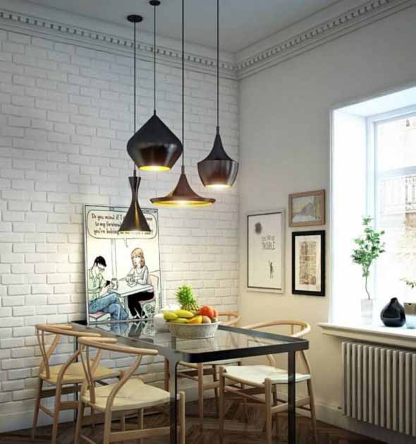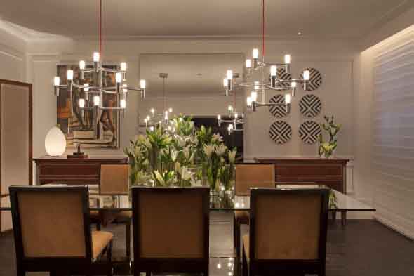 Um último detalhe, e que valoriza a decoração de cada cômodo da casa, é uma boa iluminação, que na sala de jantar pode ser obtida com o uso de luminárias, lustres e pendentes, em modelos e estilos arrojados e convidativos.