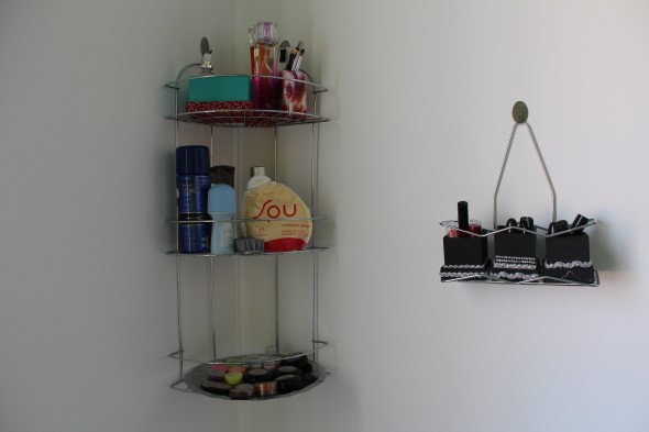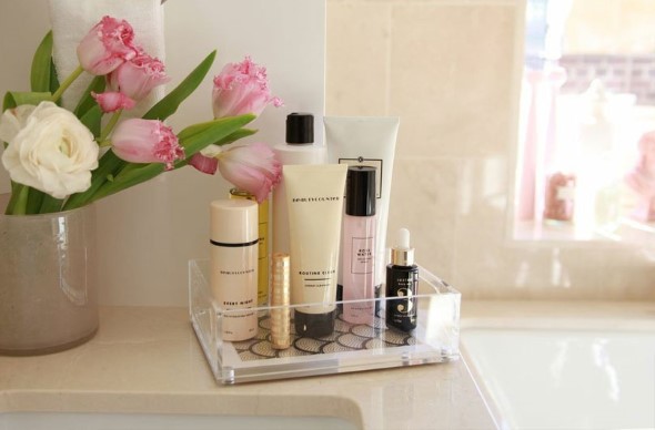 Tem também as bandejas e potes, que podem ser deixados sobre a bancada do lavatório, para colocar escovas, pincéis de maquiagem, sabonete líquido, e outros itens.