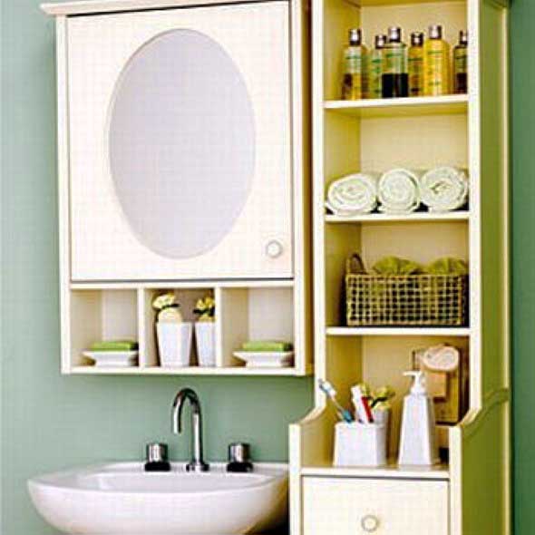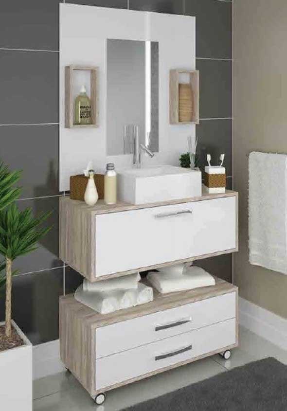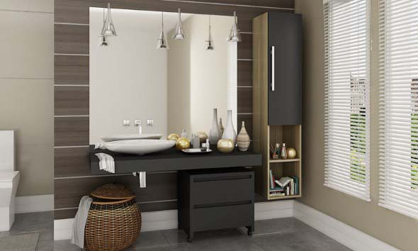 Também é possível garantir mais espaço para deixar tudo bem organizado dentro do banheiro, com o uso de armários, em tamanhos variados, como os modelos que se adaptam abaixo dos modernos lavatórios e cubas atuais.