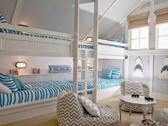 Em seguida é importante otimizar o espaço interno de cada ambiente, que em geral na casa de praia são mais amplos e mais arejados. Neste sentido escolha móveis bem funcionais, como beliches, armários, prateleiras e nichos, que ajudam a otimizar todo o espaço do local.
